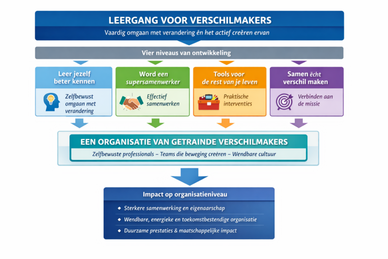 Leidt uw mensen op tot Verschilmakers. Dit in-company ontwikkeltraject leert professionals en teams beter omgaan met verandering én bouwt duurzame vaardigheden om positieve verandering actief te creëren. De leergang transformeert uw organisatie tot een organisatie van getrainde Verschilmakers. Een team van zelfbewuste, goed samenwerkende en verandervaardige mensen die samen de werkelijke impact van uw organisatie vormgeven.